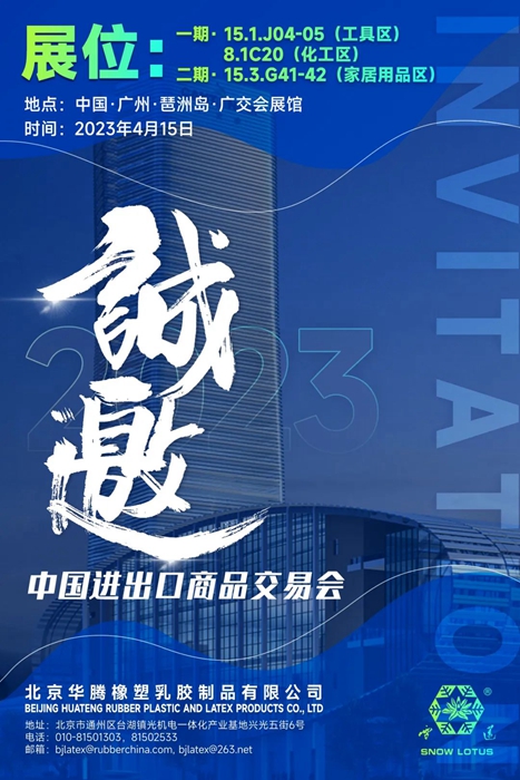 华腾橡塑继4月15日至19日在工具区、化工区参加第一期广交会后,于4月23日至27日将在第二期家居用品区设有展位。在此恭候您的到来。